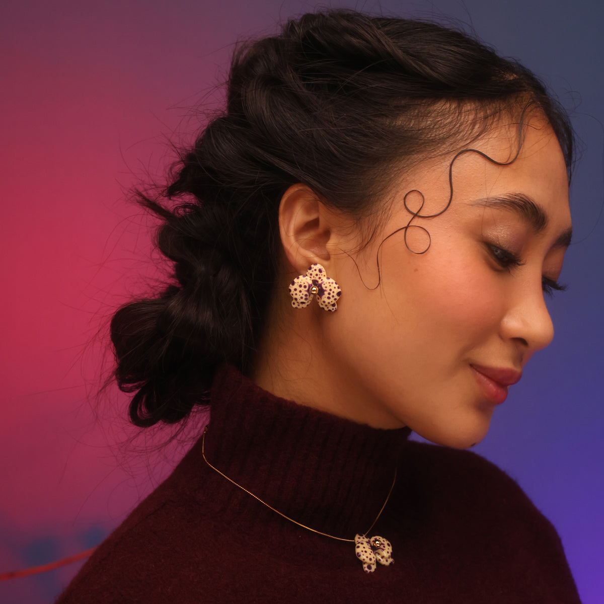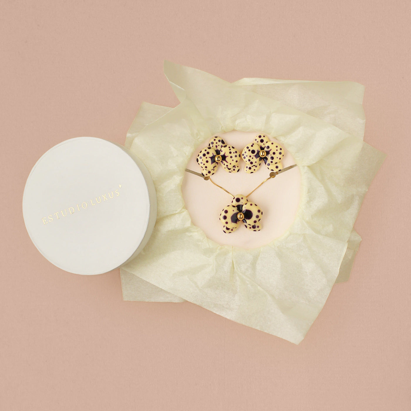 El Set incluye el par de aretes + el collar a juego en el mismo tono en su cajita de regalo con una tarjeta de dedicatoria y un pañito de limpieza especial. Hechas a mano en resina ecológica, palitos de plata 925 y botones de plata 950 con baño de oro 18 K.